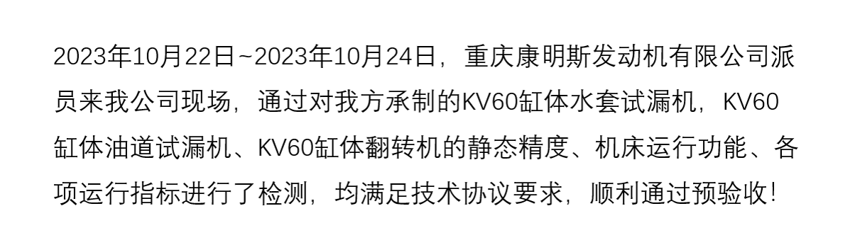 熱烈祝賀重慶康明斯發(fā)動(dòng)機(jī)有限公司KV60缸體水套試漏機(jī)、KV60缸體油道試漏機(jī)、KV60缸體翻轉(zhuǎn)機(jī)順利通過預(yù)驗(yàn)收!