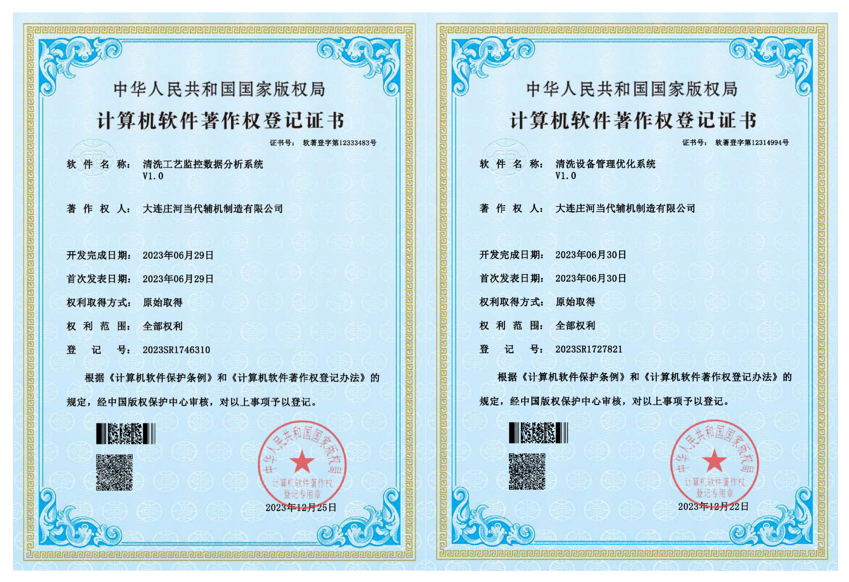 ? ? ? ?2023年12月22日、 2023年12月25日,中國人民共和國國家版權(quán)局分別向著作權(quán)人大連莊河當(dāng)代輔機(jī)制造有限公司頒發(fā)了《計算機(jī)軟件著作權(quán)登記證書》。
